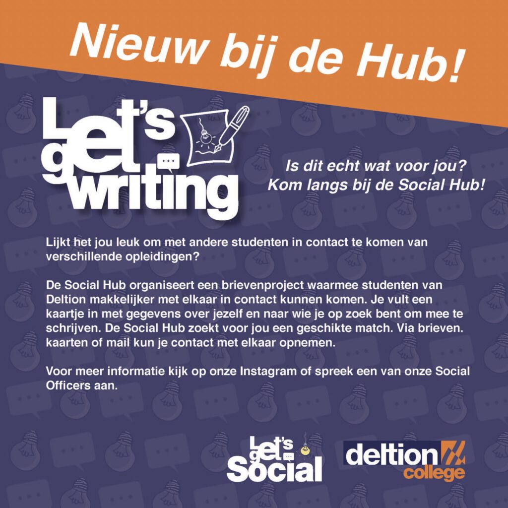 Het brieven project Let’s Get Writing is een project van de Social Hub in Deltion om studenten van verschillende opleidingen met elkaar in contact te brengen. Hiervoor mocht ik een aantal promotie uitingen maken. Hiervoor hebben ik het logo van de Social Hub omgebouwd in de zelfde stijl naar Let’s Get Writing en ik heb het lampje vervangen door een papier met een pennetje. Vervolgens mocht ik het aanmeld kaartje maken waar studenten hun gegevens op invullen zodat ze gematcht kunnen worden aan een andere student. Daarna werd ons gevraagd om een poster, flyer en Instagram post te maken en als laatste wilden ze ook graag een logo animatie als teaser. Dit heb ik samen met een aantal medestudenten gemaakt.